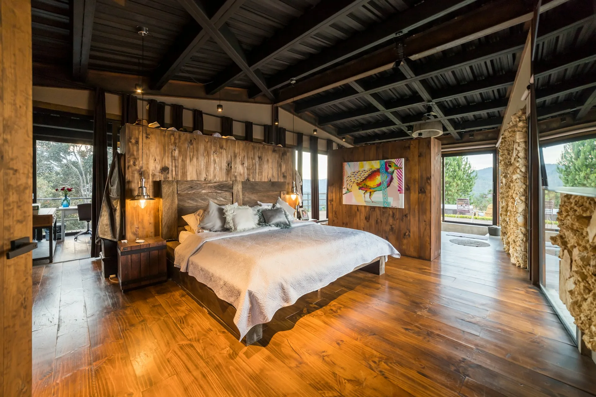 Terra blends raw textures, mountain light, and cozy interiors into a warm hillside escape. Large windows open toward sweeping valley views, while stone and wood elements bring an authentic rustic character to every corner.